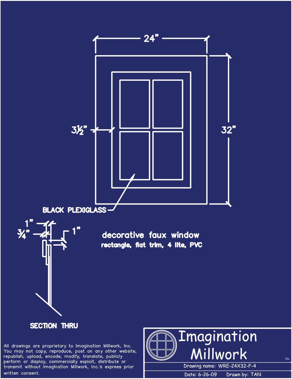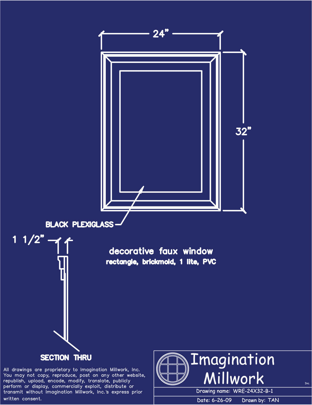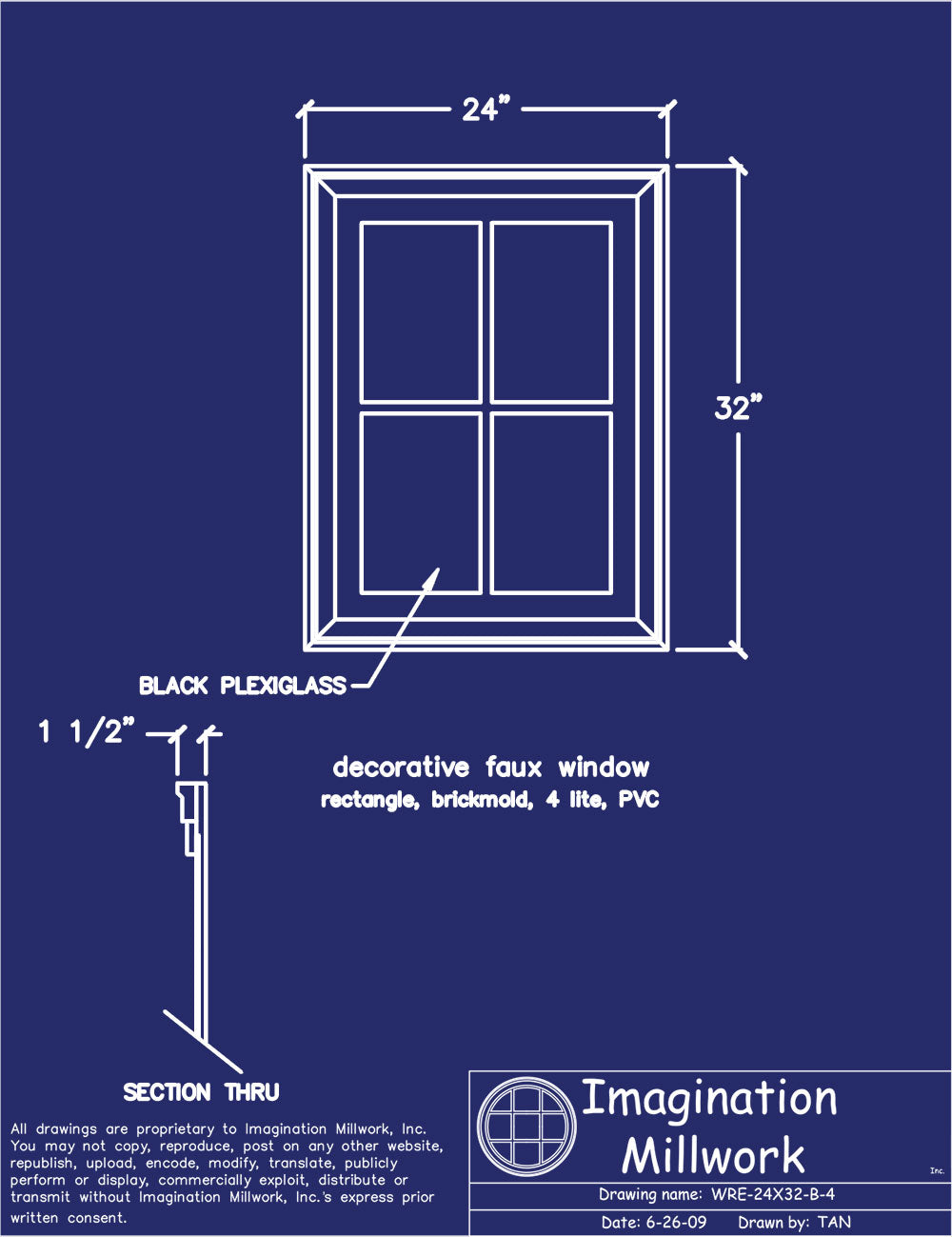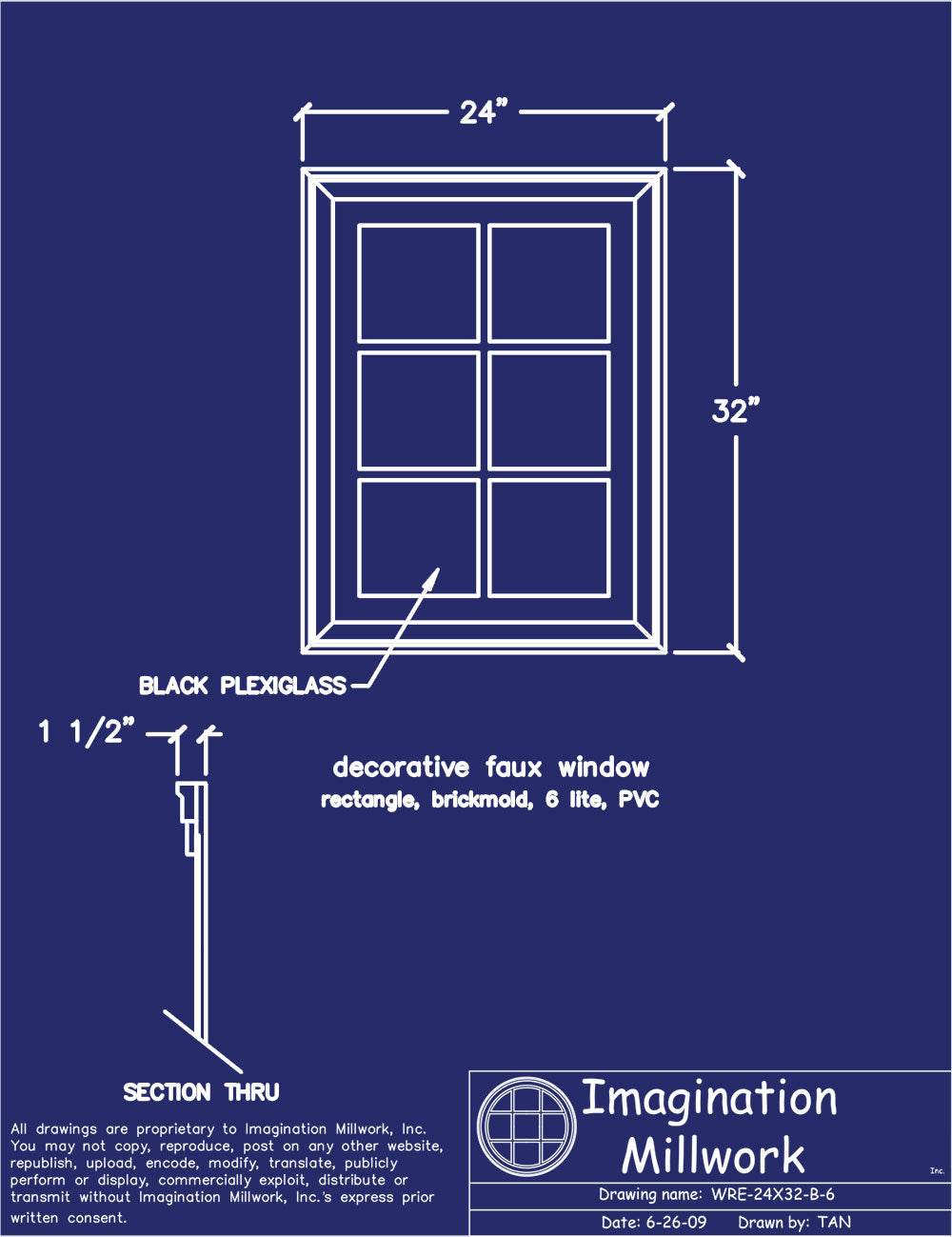 Imagination Millwork’s Decorative Faux Windows are skillfully crafted from sustainable PVC and resilient black plexiglass. The frame, trim (moulding), grilles, and keys are all constructed from durable white PVC. The faux "glass" is an opaque black plexiglass. Imagination Millwork’s Decorative Faux Windows can be installed on virtually any exterior surface and are designed so they will not pierce the building envelope*. Decorative Faux Windows require no assembly and are shipped ready-to-install. Imagination Millwork does not stock Decorative Faux Windows as they are built-to-order and manufactured at the time of purchase.