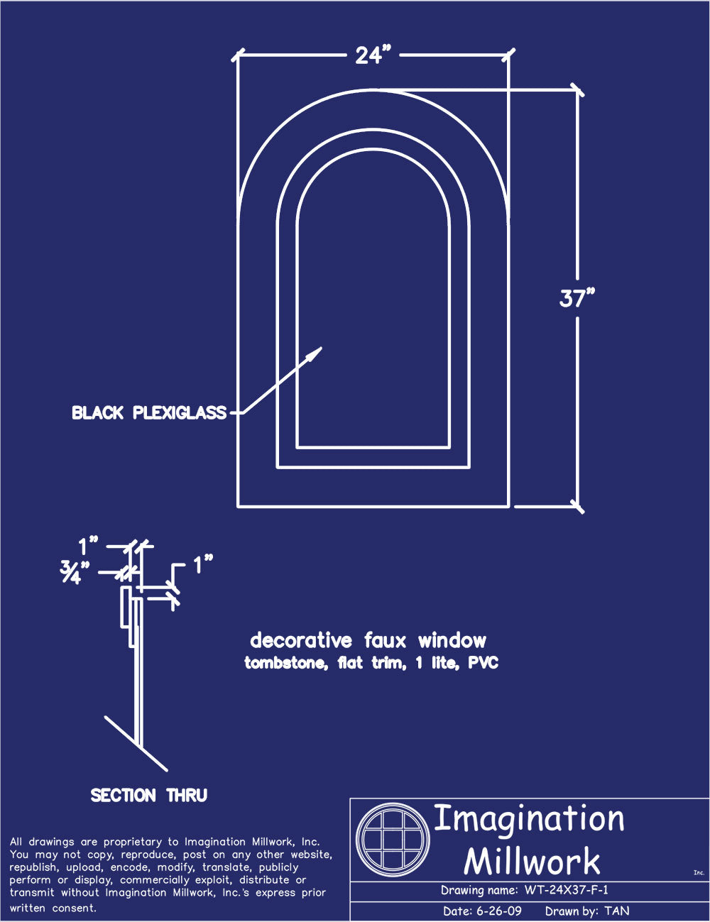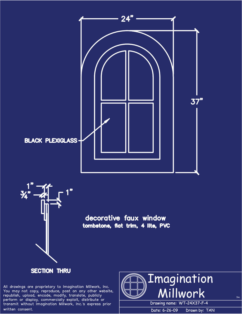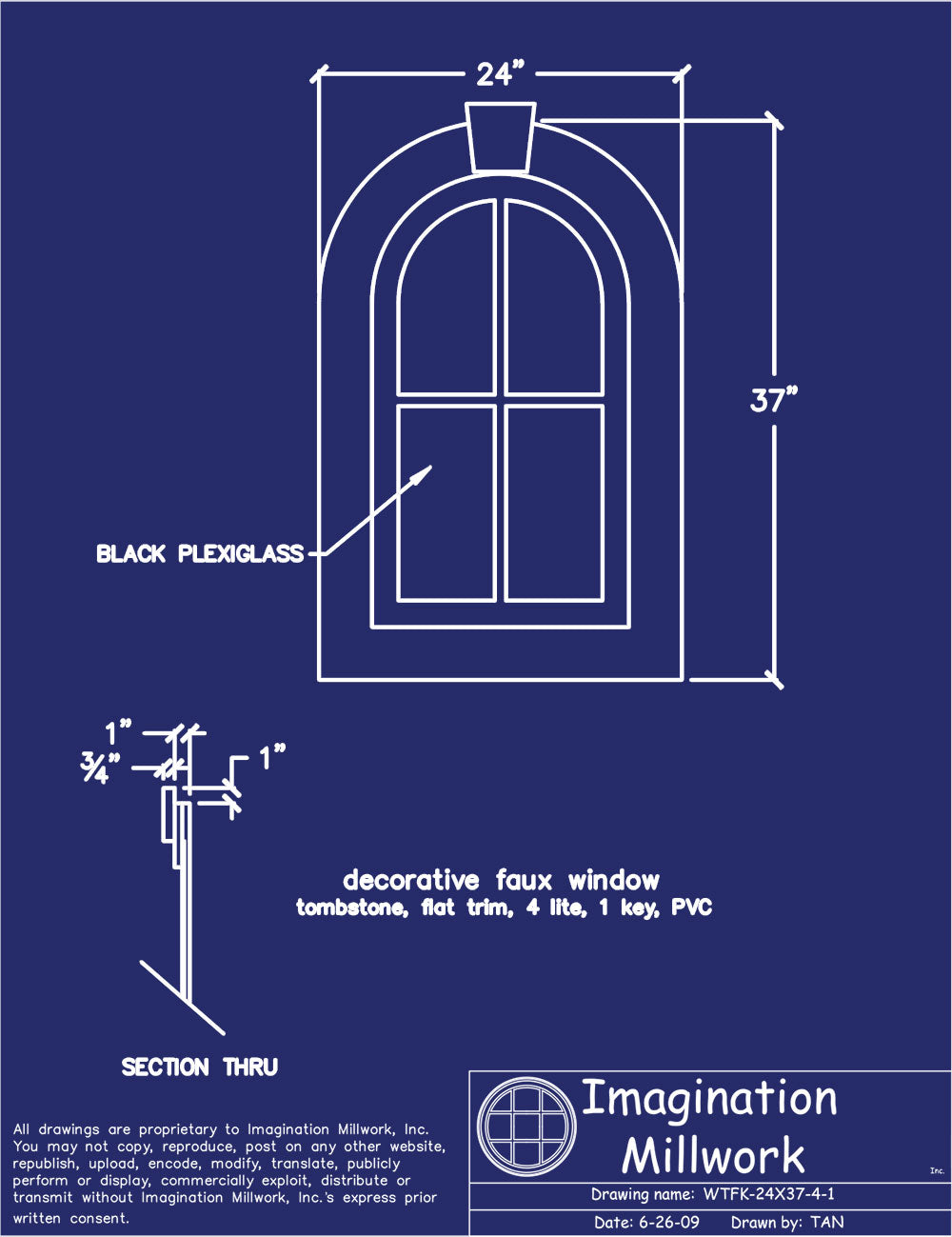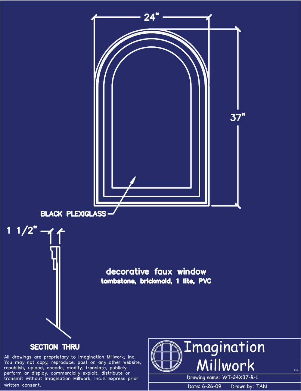 Imagination Millwork’s Decorative Faux Windows are skillfully crafted from sustainable PVC and resilient black plexiglass. The frame, trim (moulding), grilles, and keys are all constructed from durable white PVC. The faux "glass" is an opaque black plexiglass. Imagination Millwork’s Decorative Faux Windows can be installed on virtually any exterior surface and are designed so they will not pierce the building envelope*. Decorative Faux Windows require no assembly and are shipped ready-to-install. Imagination Millwork does not stock Decorative Faux Windows as they are built-to-order and manufactured at the time of purchase.
