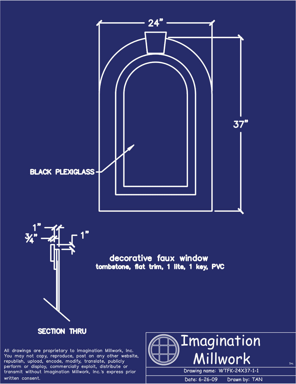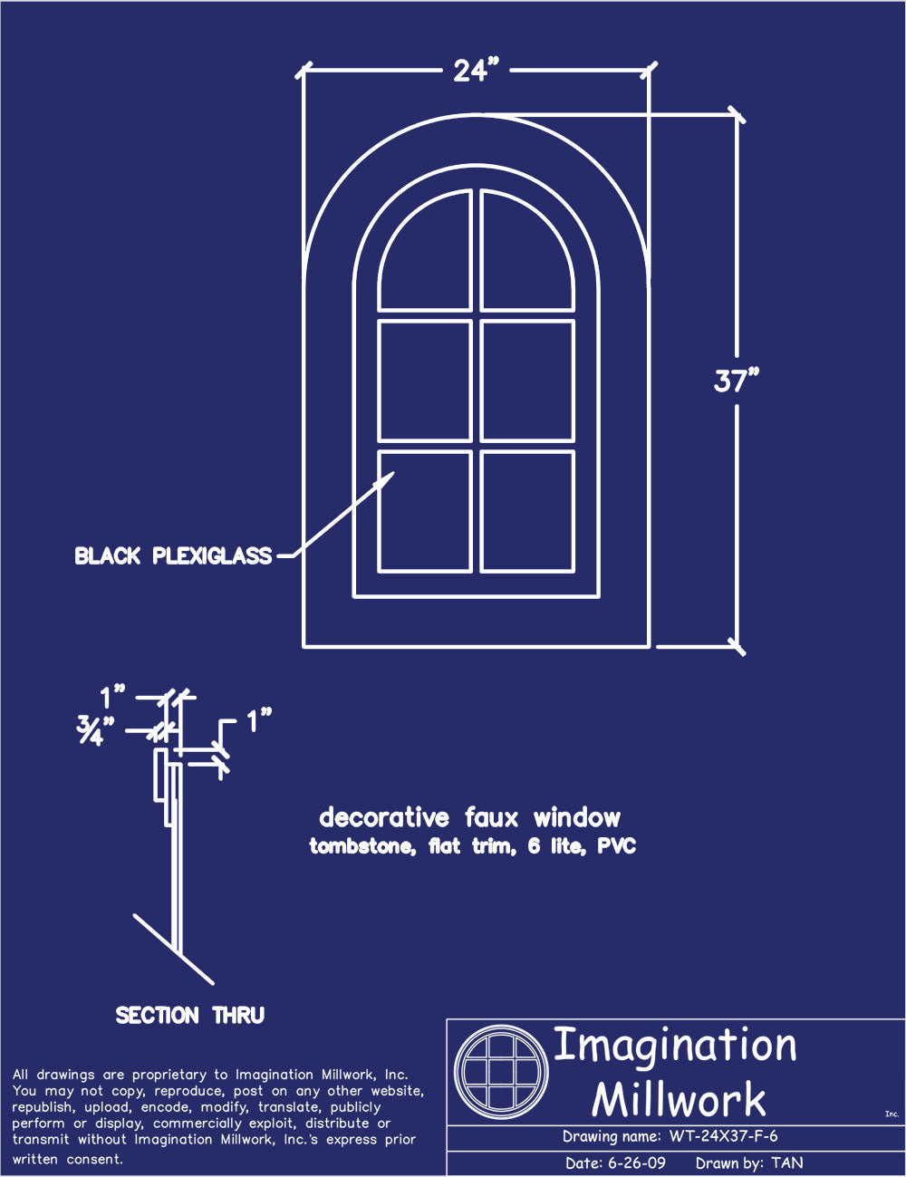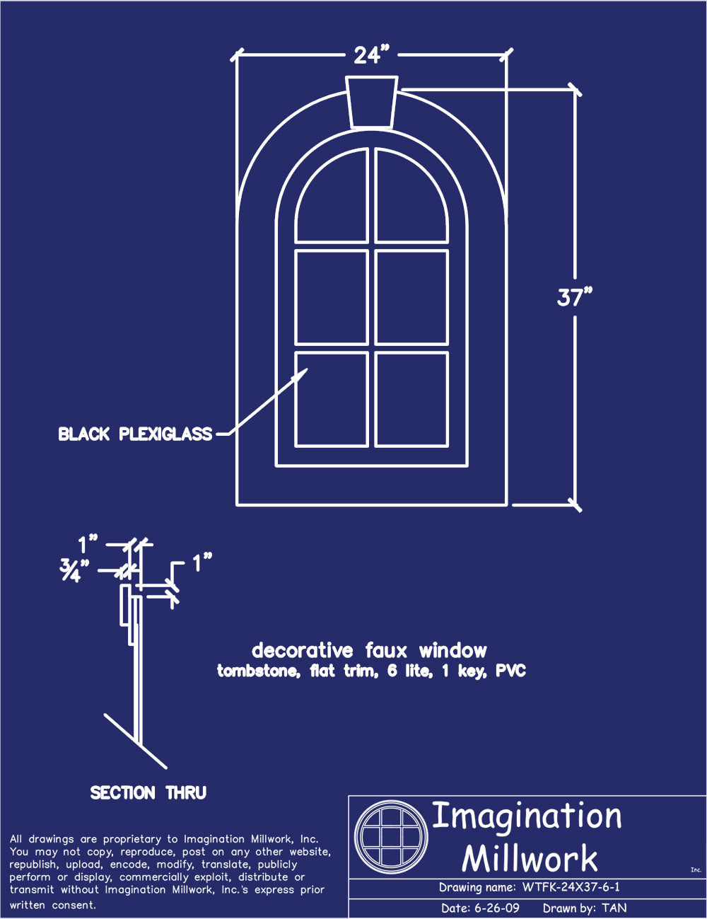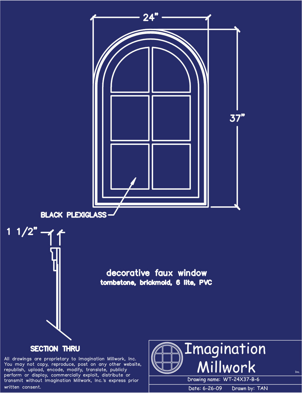 Imagination Millwork’s Decorative Faux Windows are skillfully crafted from sustainable PVC and resilient black plexiglass. The frame, trim (moulding), grilles, and keys are all constructed from durable white PVC. The faux "glass" is an opaque black plexiglass. Imagination Millwork’s Decorative Faux Windows can be installed on virtually any exterior surface and are designed so they will not pierce the building envelope*. Decorative Faux Windows require no assembly and are shipped ready-to-install. Imagination Millwork does not stock Decorative Faux Windows as they are built-to-order and manufactured at the time of purchase.