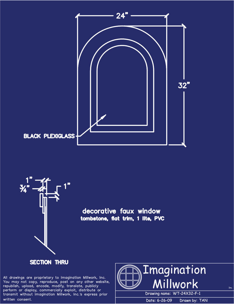 Imagination Millwork’s Decorative Faux Windows are skillfully crafted from sustainable PVC and resilient black plexiglass. The frame, trim (moulding), grilles, and keys are all constructed from durable white PVC. The faux "glass" is an opaque black plexiglass. Imagination Millwork’s Decorative Faux Windows can be installed on virtually any exterior surface and are designed so they will not pierce the building envelope*. Decorative Faux Windows require no assembly and are shipped ready-to-install. Imagination Millwork does not stock Decorative Faux Windows as they are built-to-order and manufactured at the time of purchase.